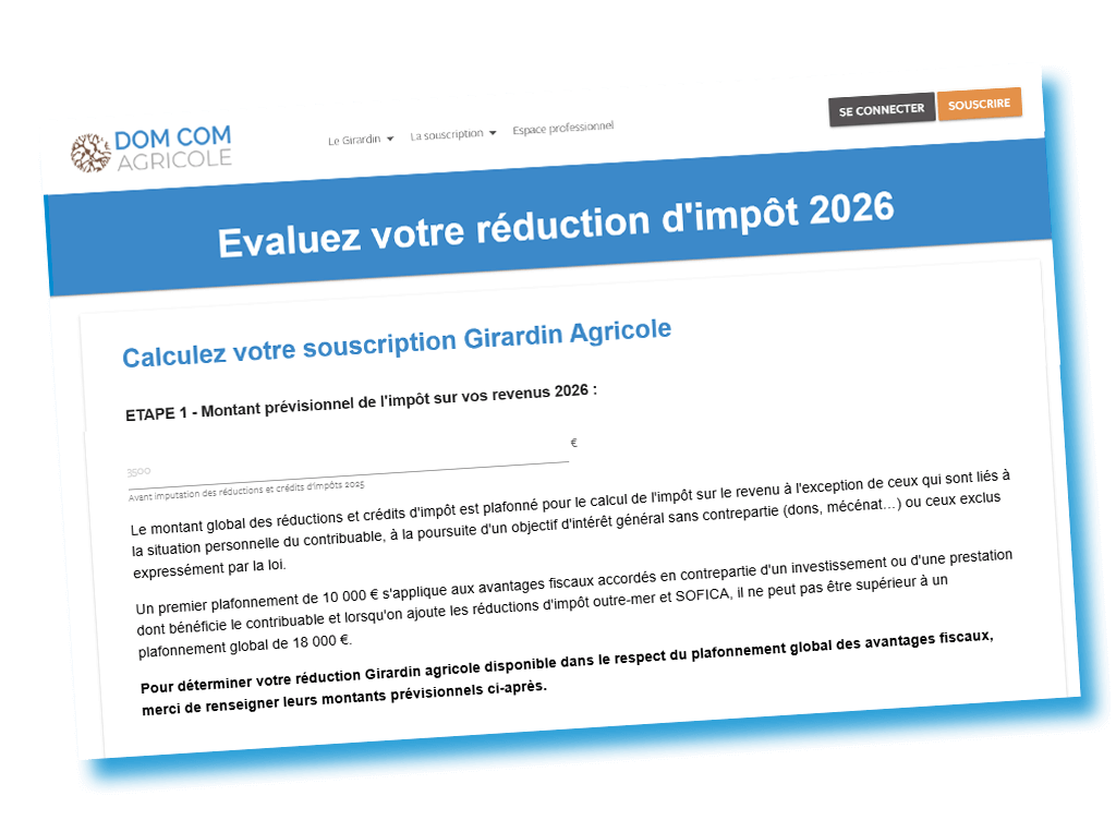 Découvrez immédiatement vos avantages fiscaux grâce à notre simulateur en ligne. Calculez votre souscription Girardin Agricole et estimez votre réduction d'impôt.
